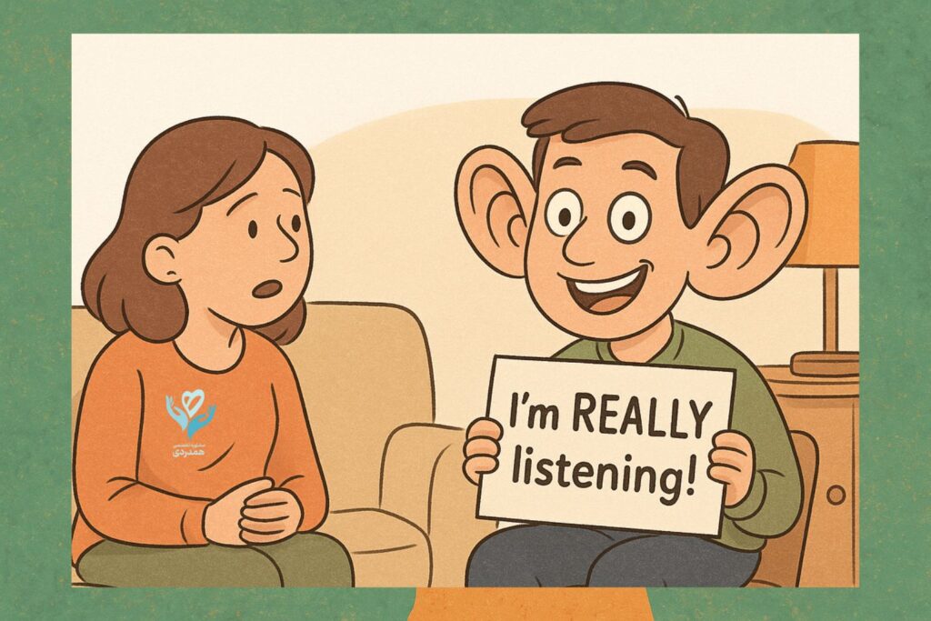 گوش دادن فعال سخته. شاید حس خستگی، بیحوصلگی یا حتی عصبانیت بیاد سراغت. به این احساسات آگاه شو، قضاوتشون نکن. به خودت بگو بعداً بهشون رسیدگی میکنی. الان فقط شنیدن مهمه. گوش دادن فعال یعنی تلاش برای موندن در لحظه، حتی اگه لحظه یه کم خستهکننده باشه!